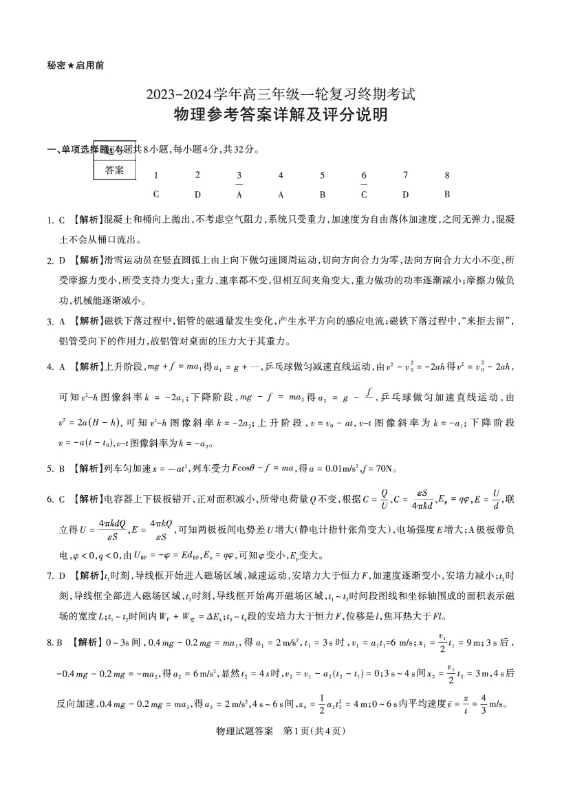 山西省2024届高三年级一轮复习终期考试物理答案