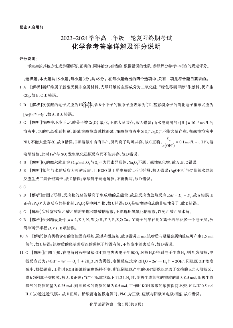 山西省2024届高三年级一轮复习终期考试化学答案