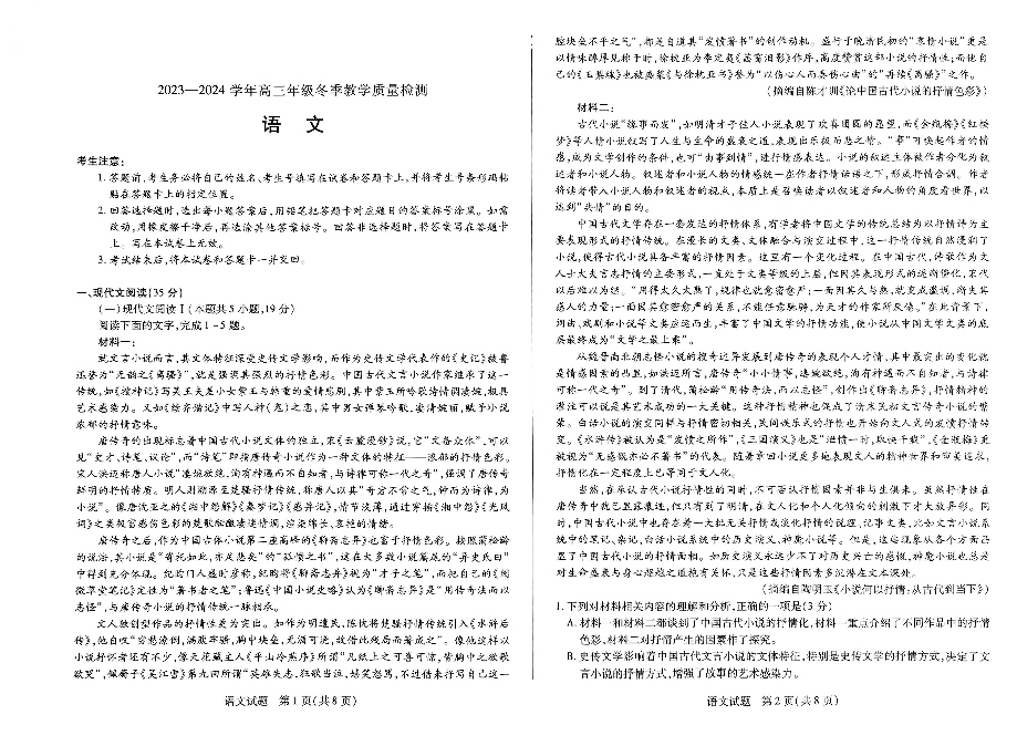 山西省大同市2023-2024学年高三上学期冬季教学质量检测 语文