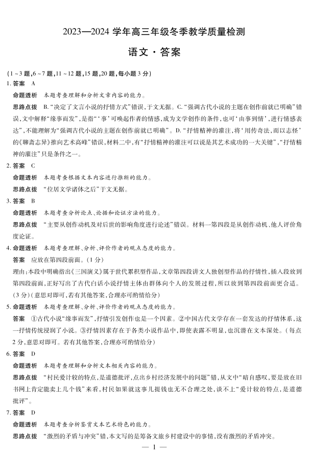 山西省大同市2023-2024学年高三上学期冬季教学质量检测 语文答案