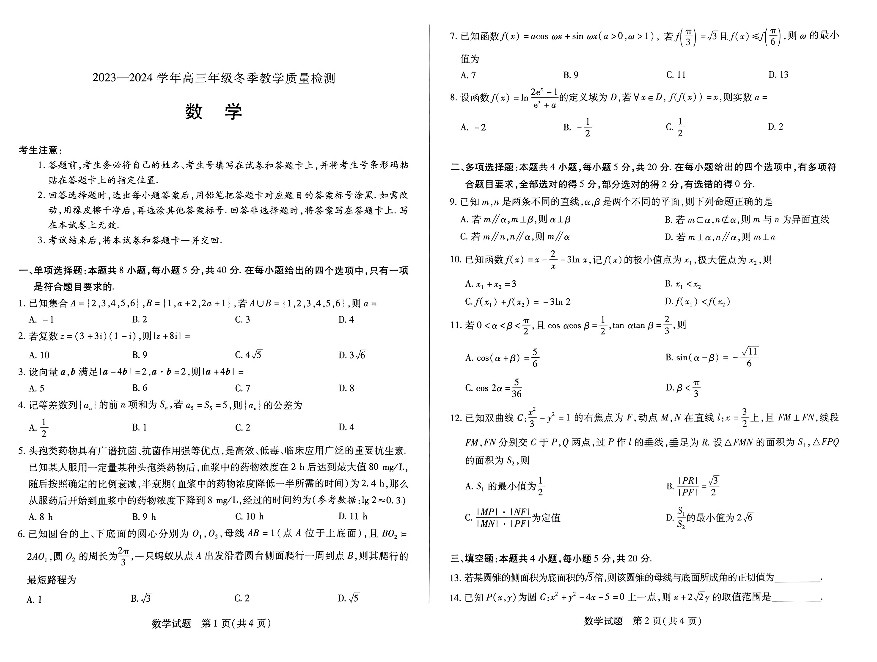 山西省大同市2024届高三上学期冬季教学质量检测数学