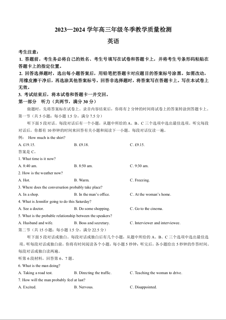 山西省大同市2023-2024学年高三上学期冬季教学质量检测 英语