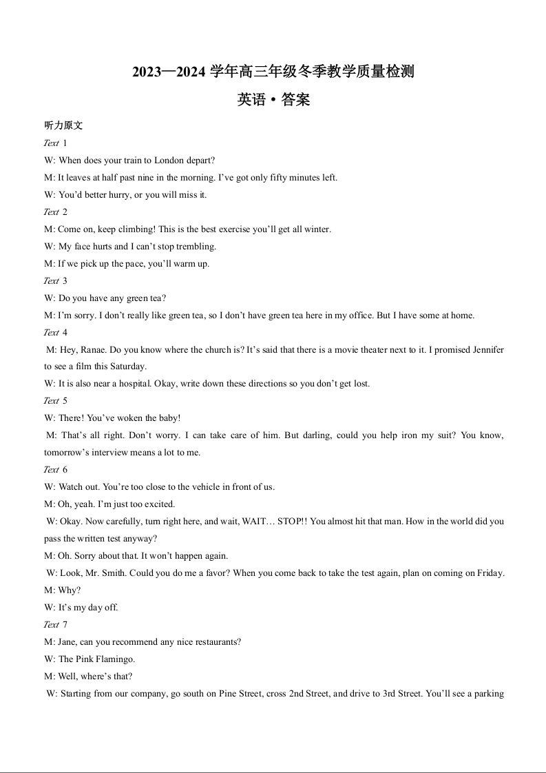 山西省大同市2023-2024学年高三上学期冬季教学质量检测 英语答案