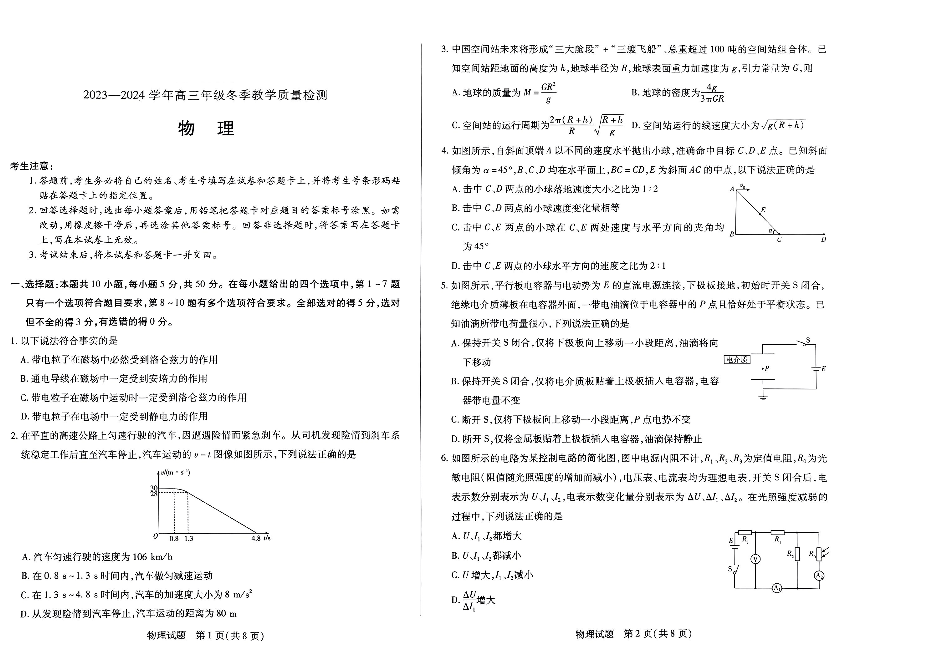 山西省大同市2023-2024学年高三上学期冬季教学质量检测 物理
