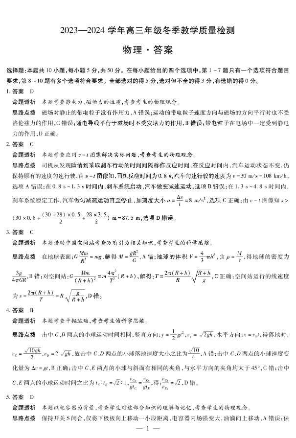 山西省大同市2023-2024学年高三上学期冬季教学质量检测 物理答案