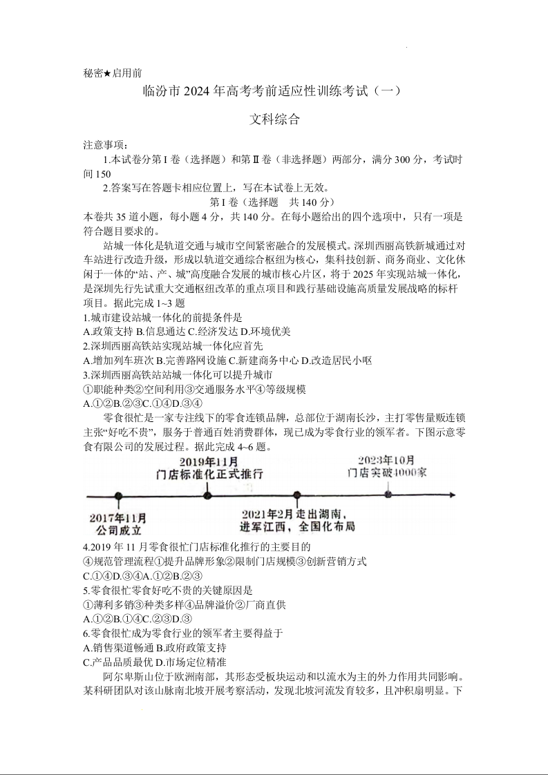 山西省临汾市2024届高考考前适应性训练考试(一)文综+答案