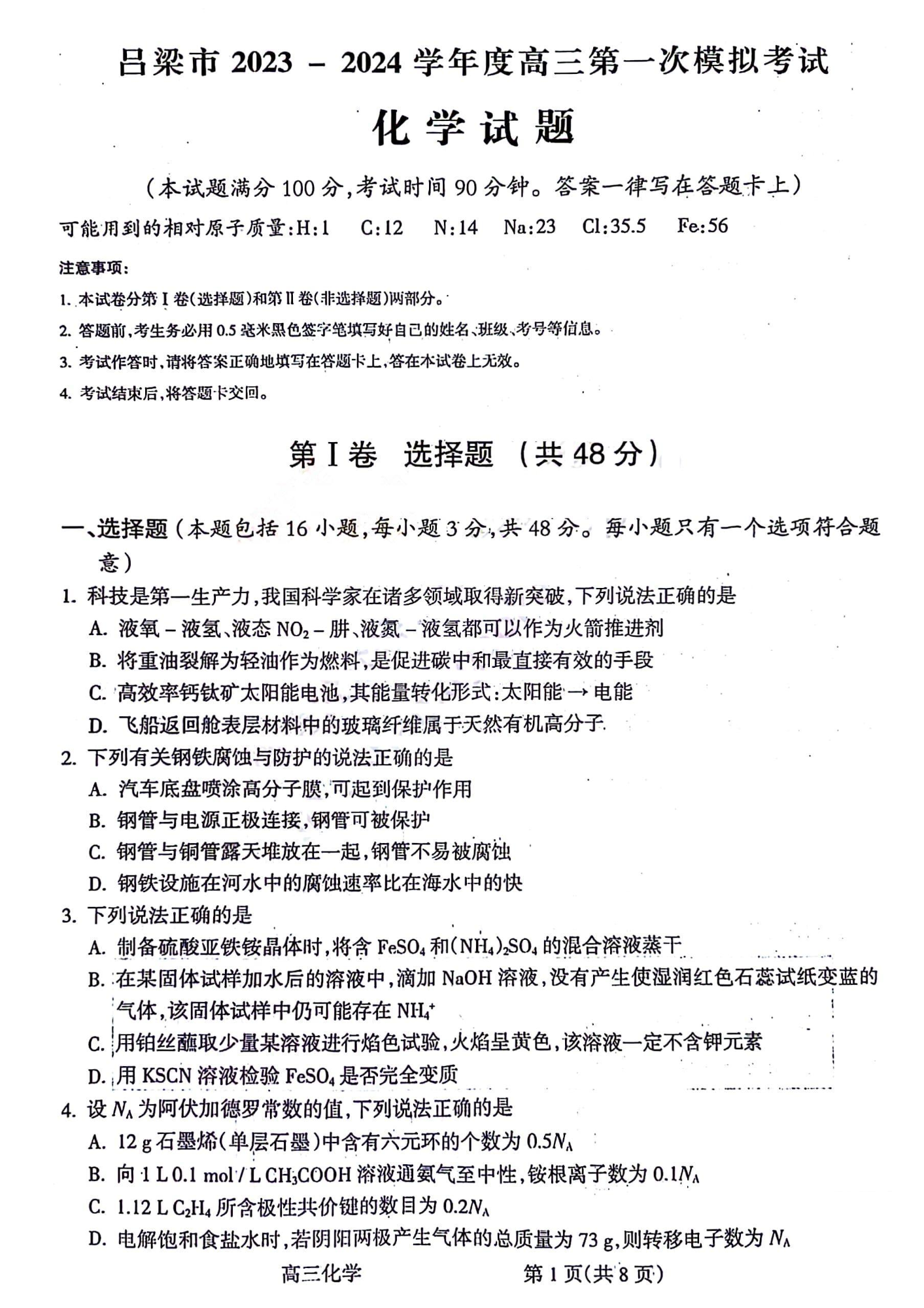 山西省太原市2024届高三上学期期末学业诊断化学