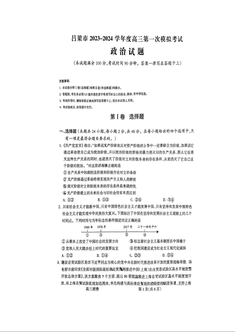 山西省吕梁市2024届高三上学期1月期末考试政治