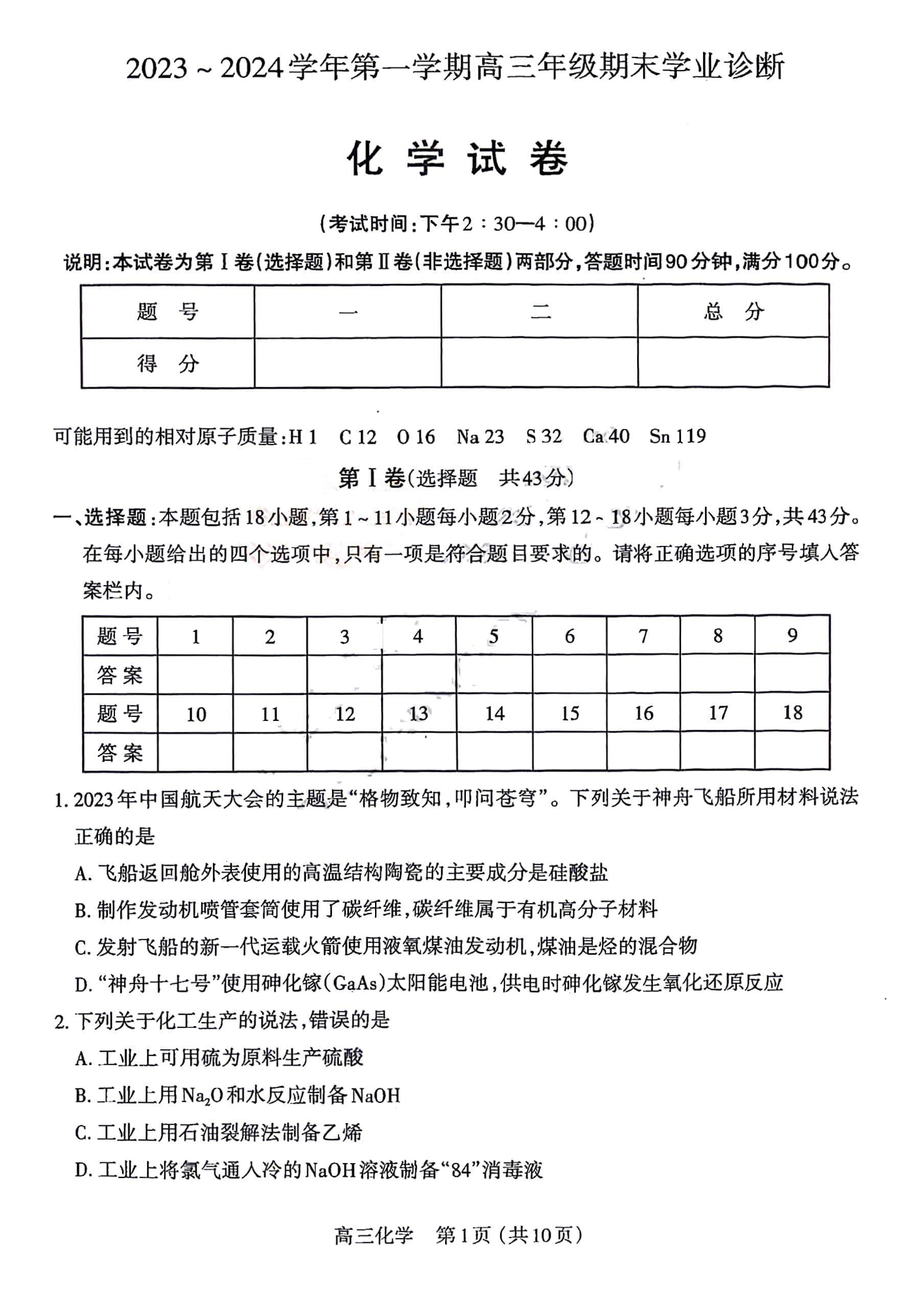 山西省太原市2024届高三上学期期末学业诊断化学