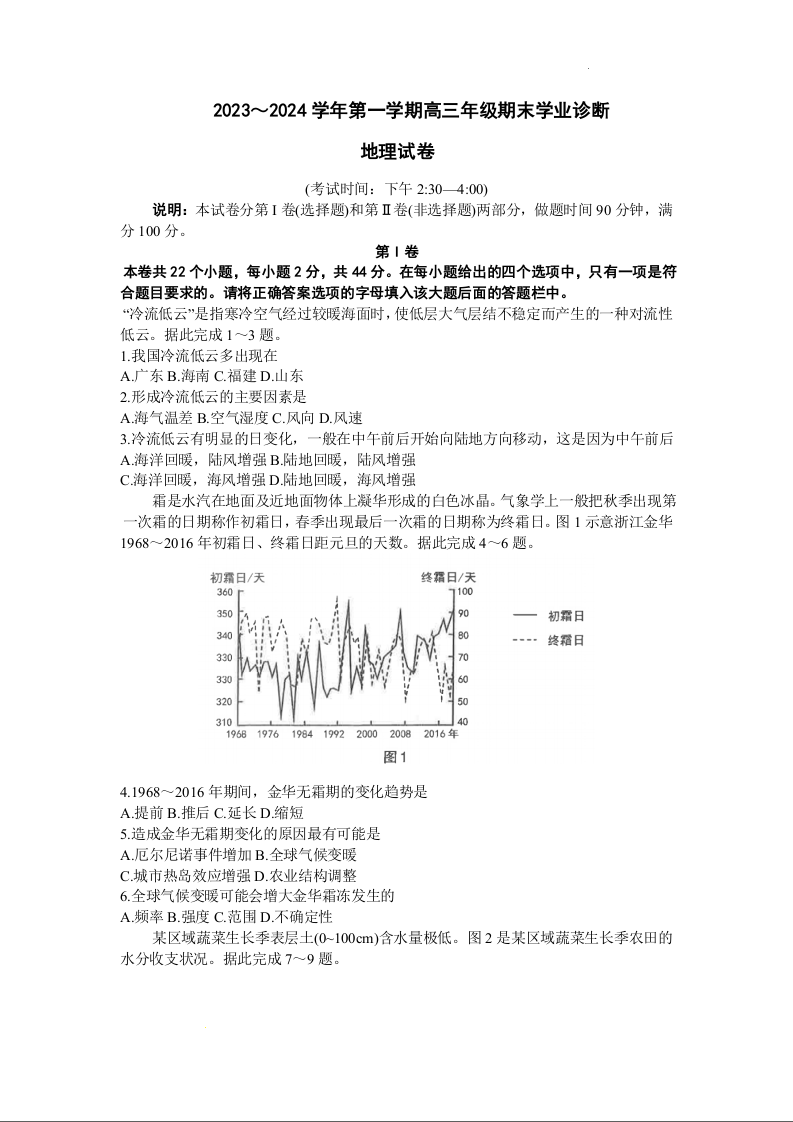 山西省太原市2024届高三上学期期末学业诊断地理