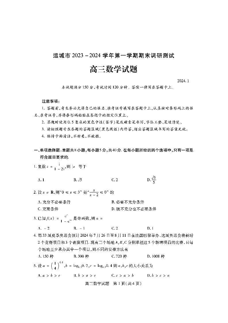 山西省运城市2024届高三上学期期末调研测试数学