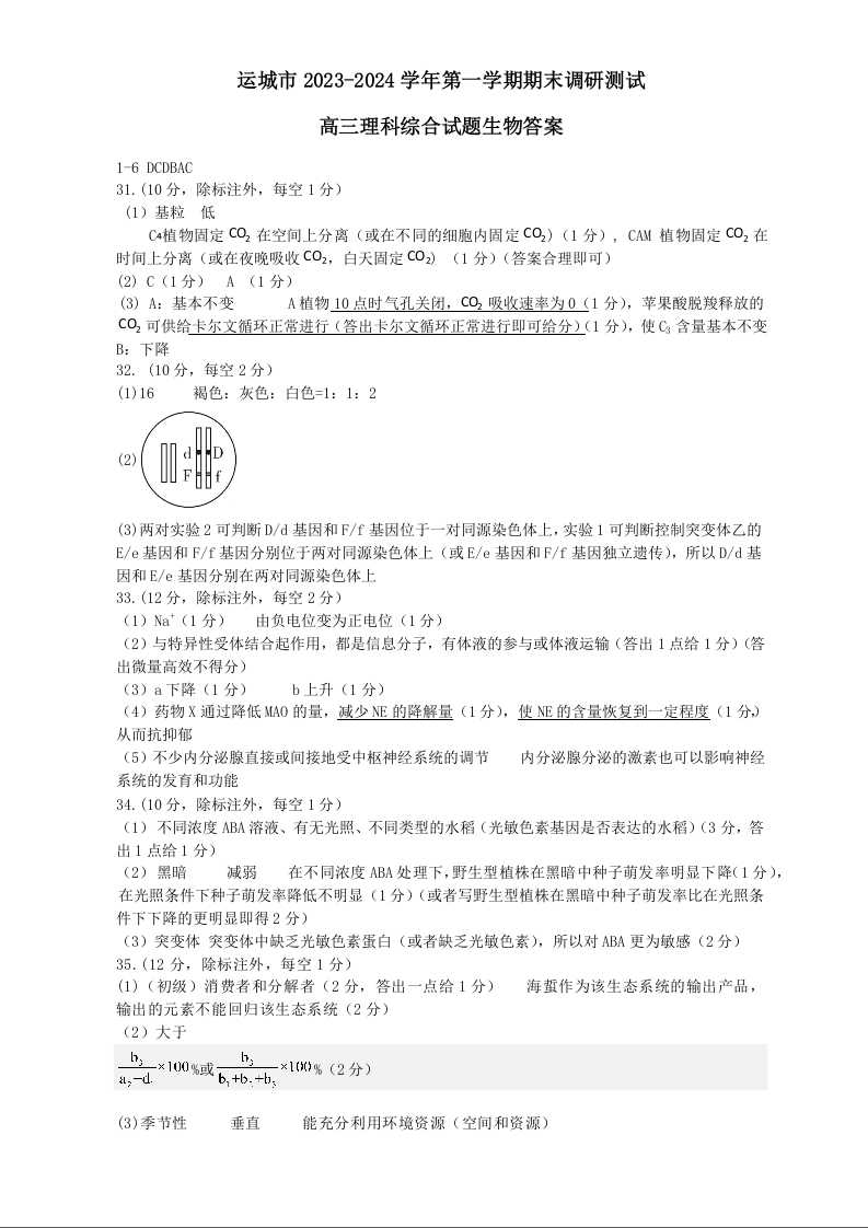 山西省运城市2024届高三上学期期末调研测试生物答案