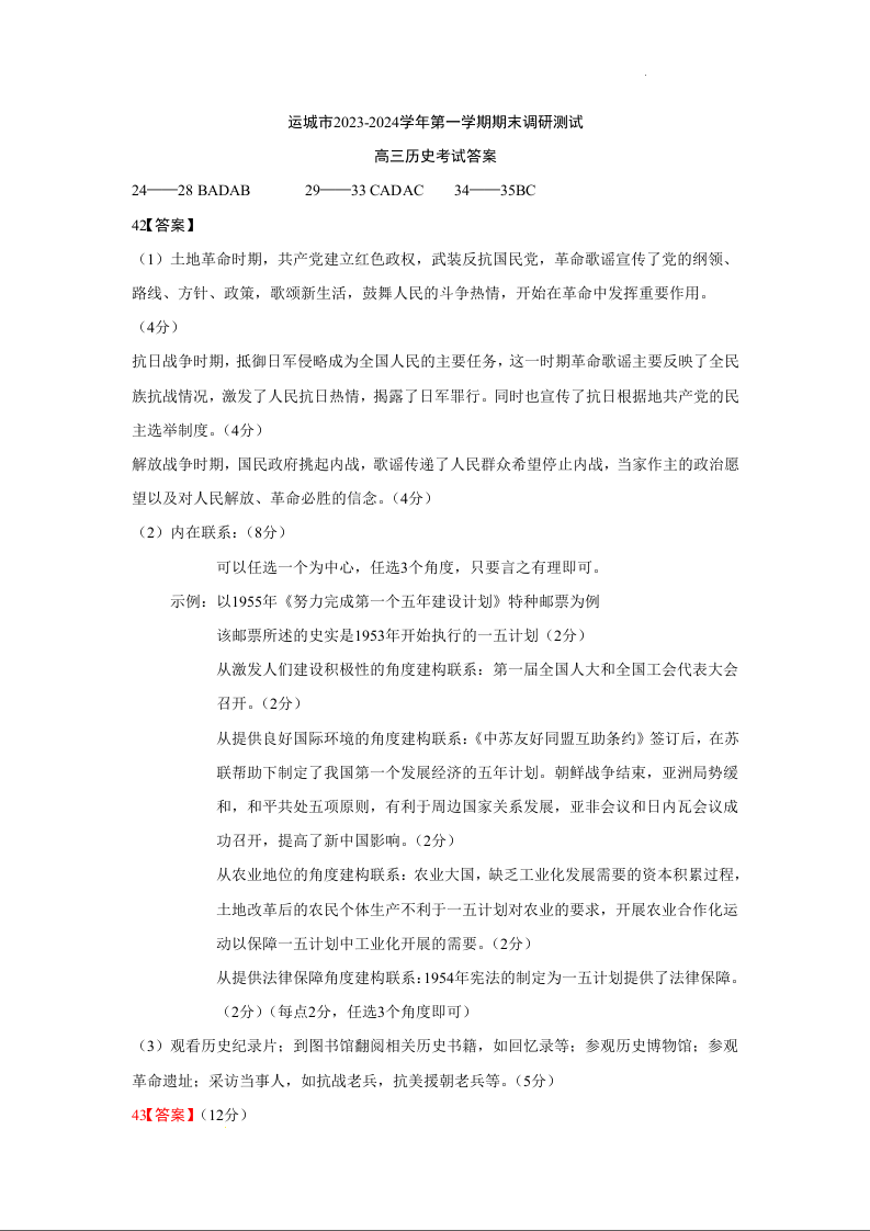 山西省运城市2024届高三上学期期末调研测试历史答案