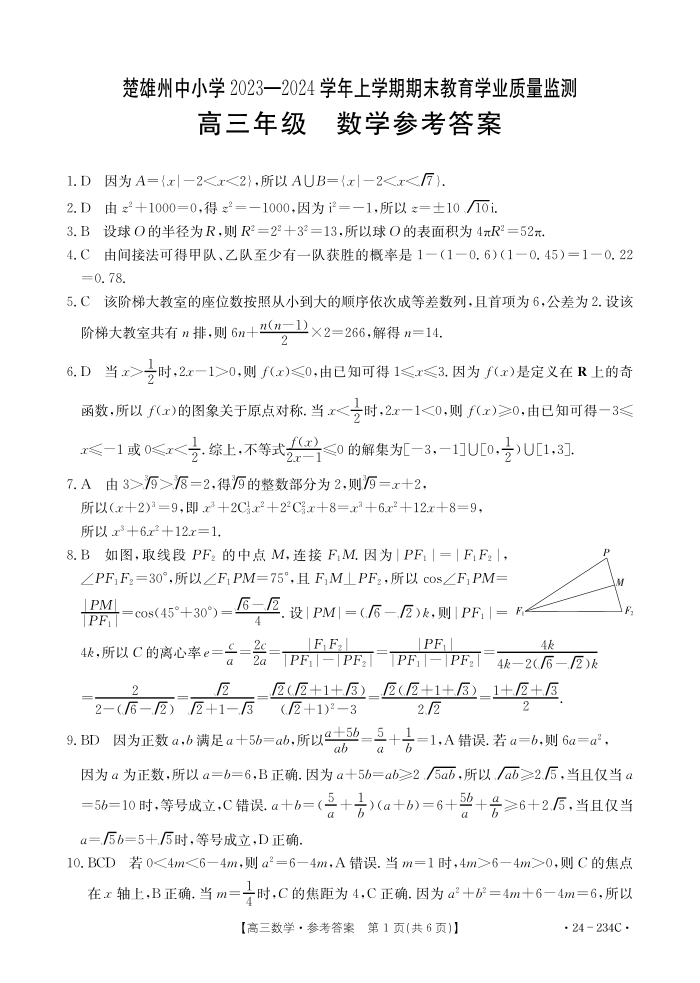 云南省楚雄彝族自治州2024届高三上学期1月期末数学答案