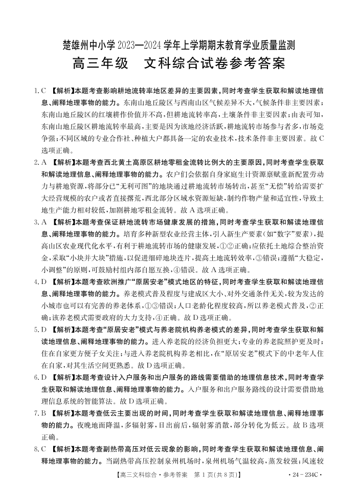云南省楚雄彝族自治州2024届高三上学期1月期末文综答案