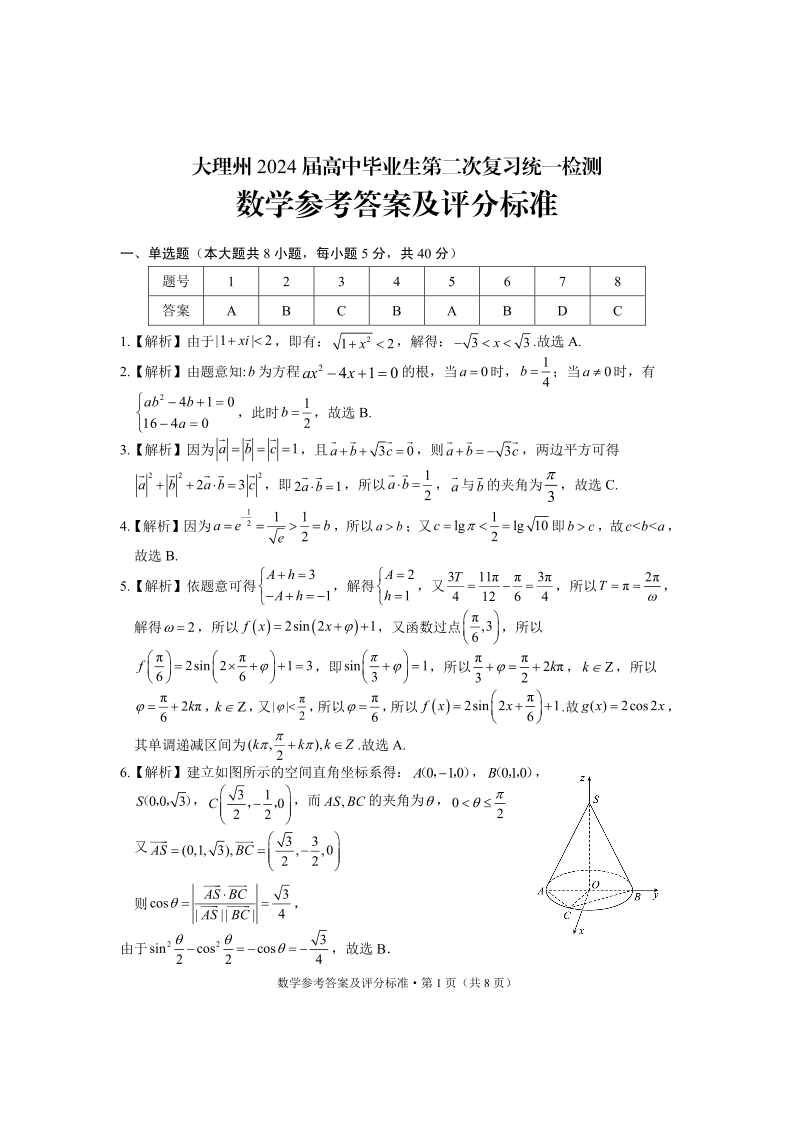 云南省大理州2024届高中毕业生第二次复习统一检测数学答案
