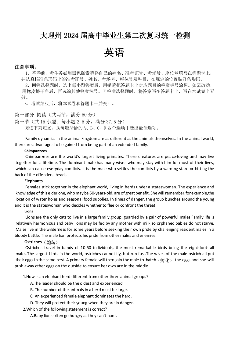 云南省大理州2024届高中毕业生第二次复习统一检测英语