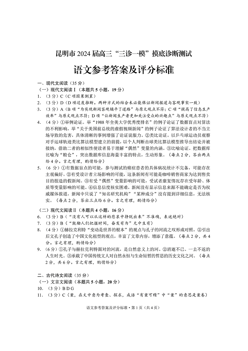 云南省昆明市2024届高三“三诊一模”摸底诊断测试语文答案