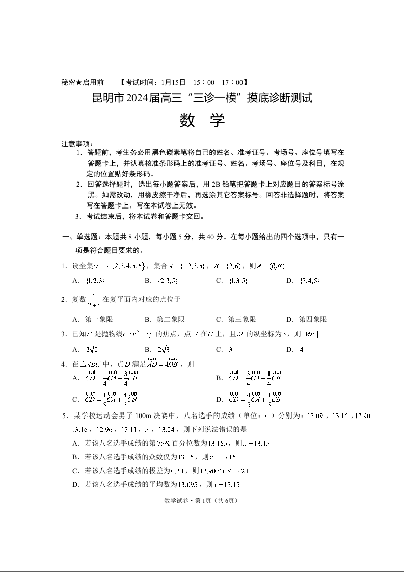 云南省昆明市2024届高三“三诊一模”摸底诊断测试数学