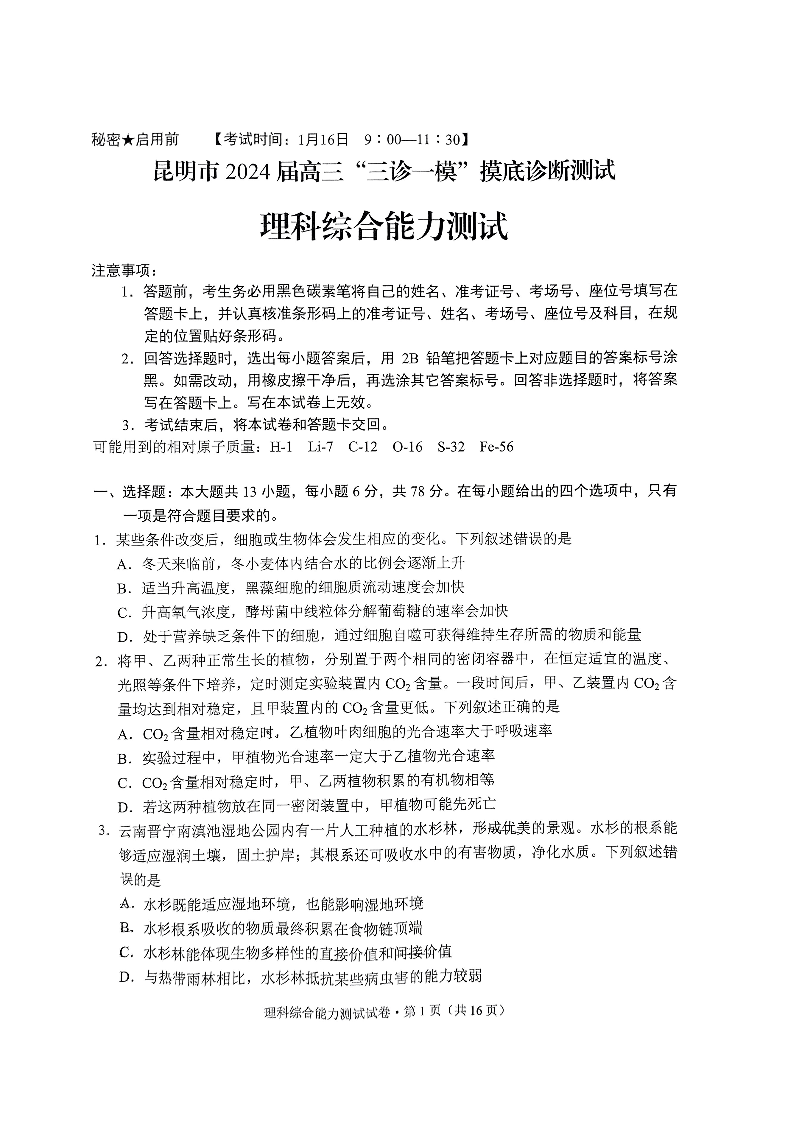 云南省昆明市2024届高三“三诊一模”摸底诊断测试理综