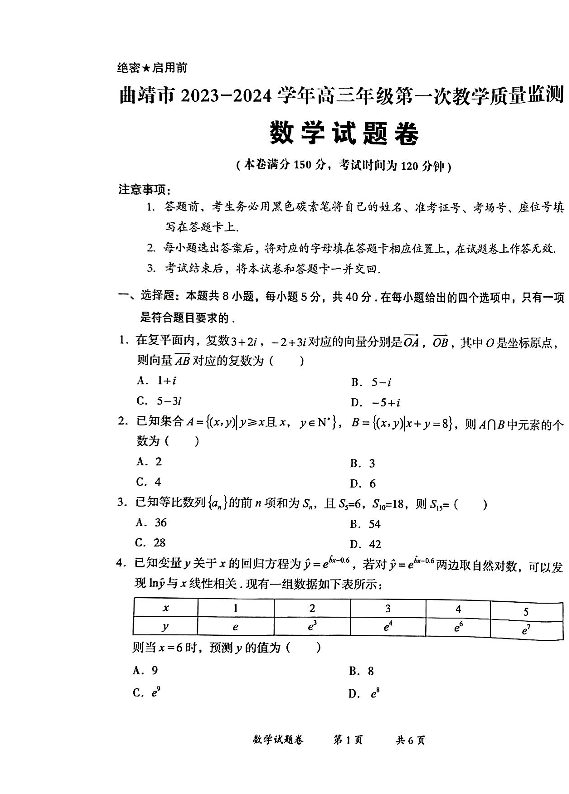 云南省曲靖市2024届高三第一次教学质量监测数学