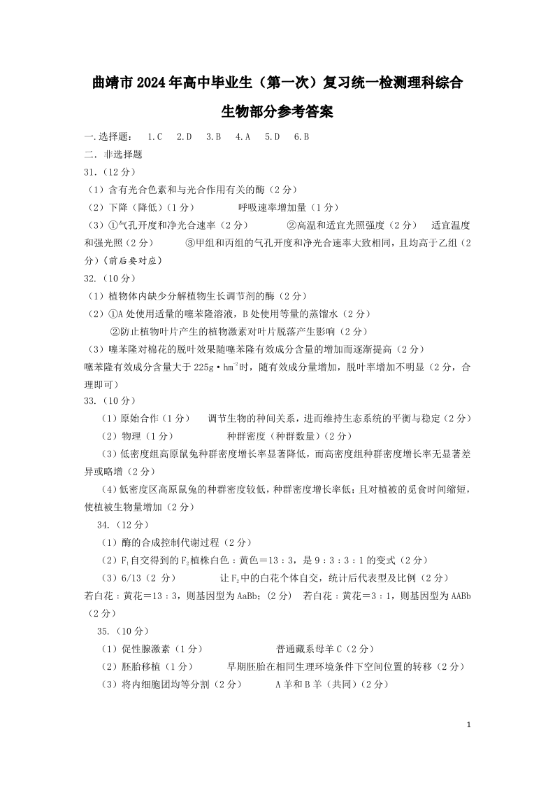 云南省曲靖市2024届高三第一次教学质量监测理综答案