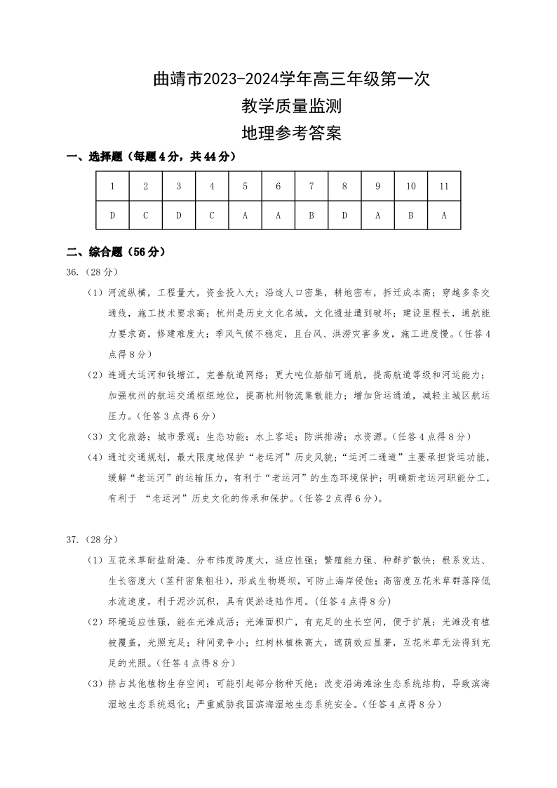 云南省曲靖市2024届高三第一次教学质量监测文科综合答案