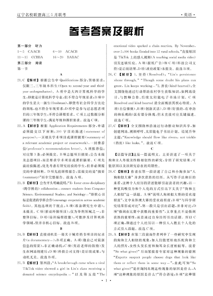 辽宁省名校联盟 2024-2025学年下学期5月高三联合考试英语答案