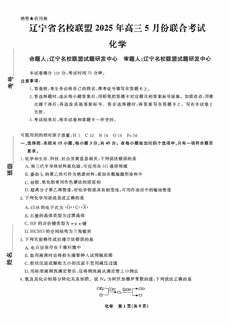 辽宁省名校联盟 2024-2025学年下学期5月高三联合考试化学
