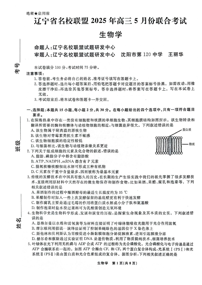 辽宁省名校联盟 2024-2025学年下学期5月高三联合考试生物