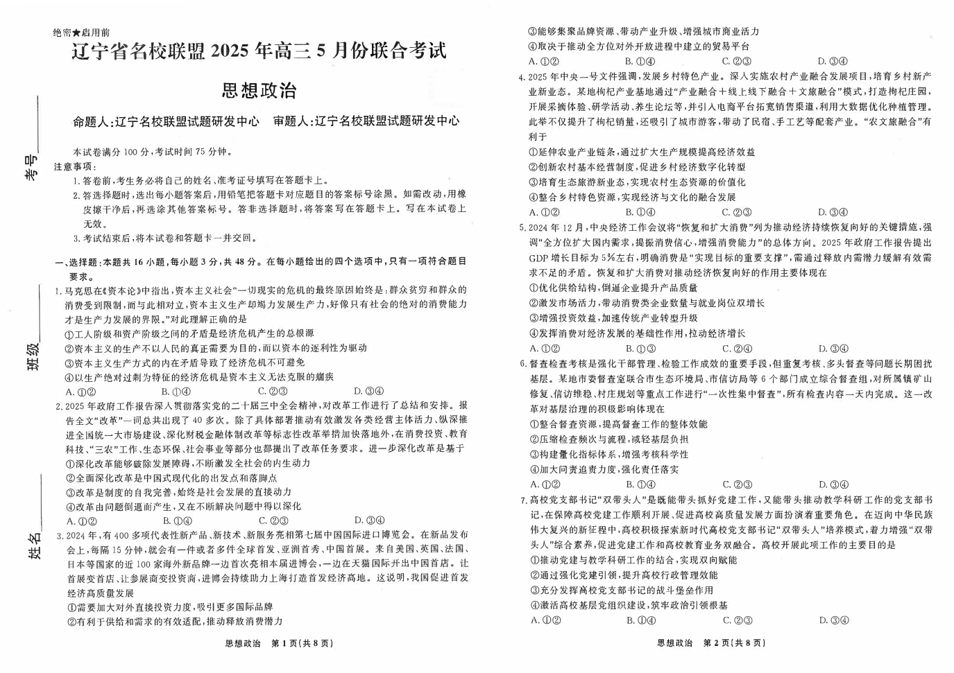 辽宁省名校联盟 2024-2025学年下学期5月高三联合考试政治