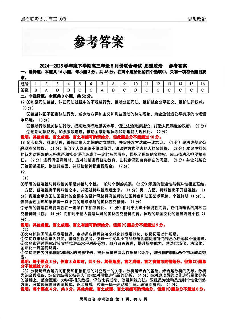 辽宁省点石联考2024-2025学年下学期5月高三联合考试政治答案
