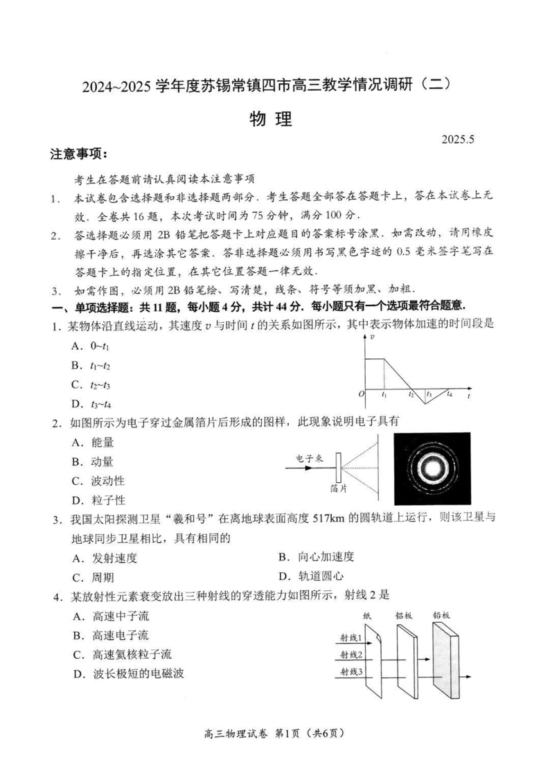 江苏省苏锡常镇四市2024-2025学年下学期5月高三教学情况调研(二)物理+答案