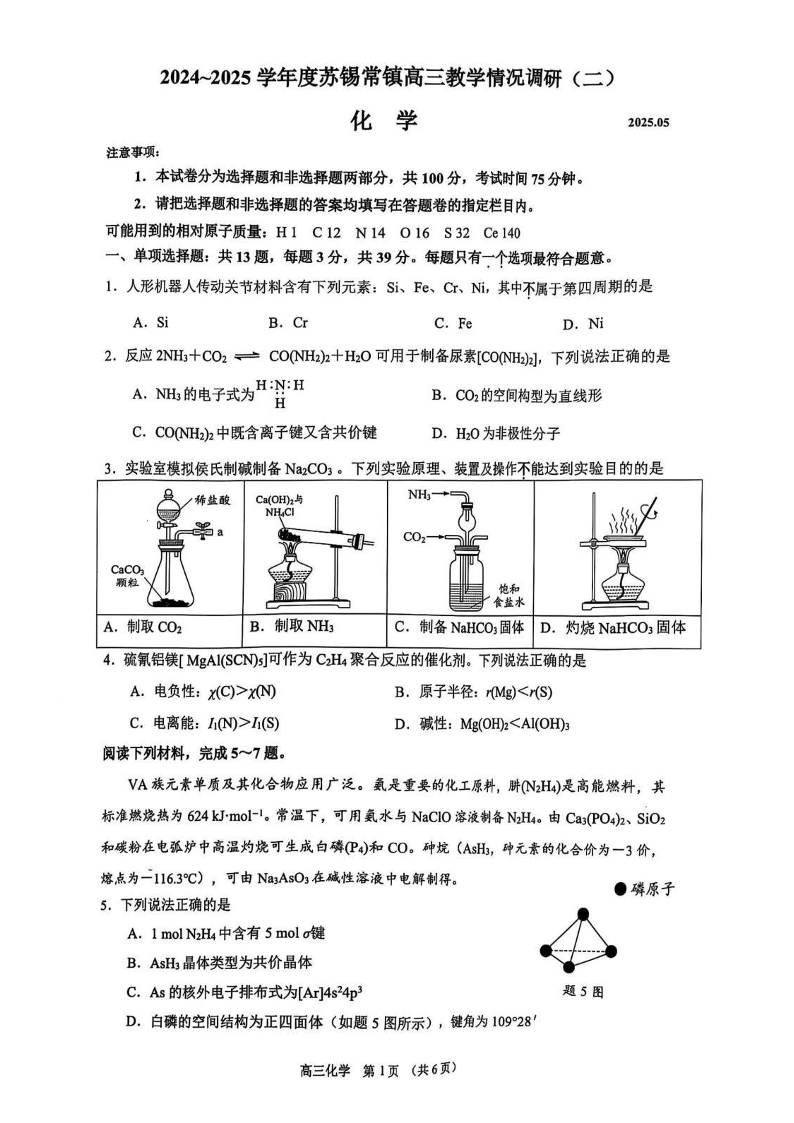 江苏省苏锡常镇四市2024-2025学年下学期5月高三教学情况调研(二)化学+答案