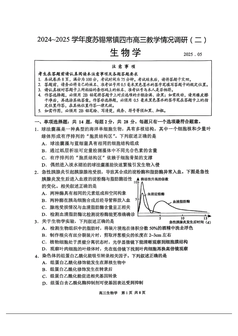 江苏省苏锡常镇四市2024-2025学年下学期5月高三教学情况调研(二)生物+答案