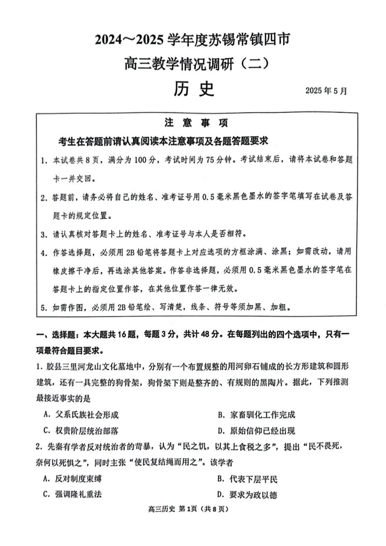 江苏省苏锡常镇四市2024-2025学年下学期5月高三教学情况调研(二)历史+答案