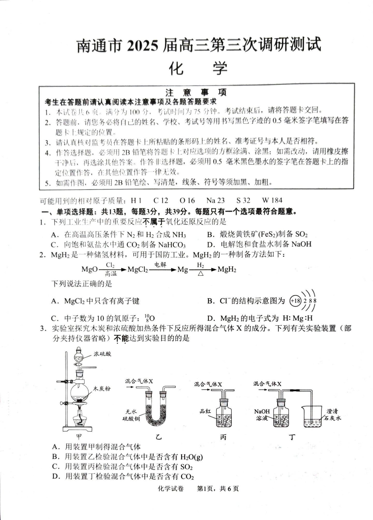 江苏省南通市等苏北八市2024-2025学年高三第三次调研测试化学+答案