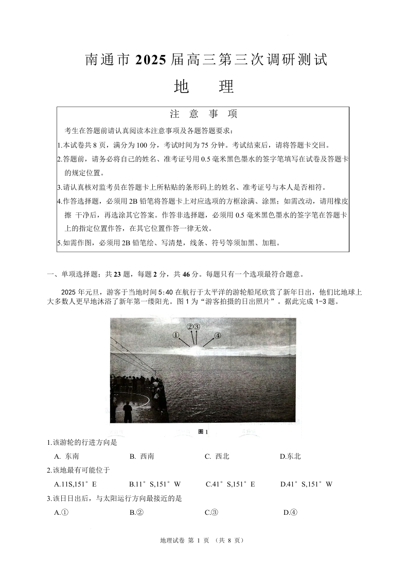 江苏省南通市等苏北八市2024-2025学年高三第三次调研测试地理
