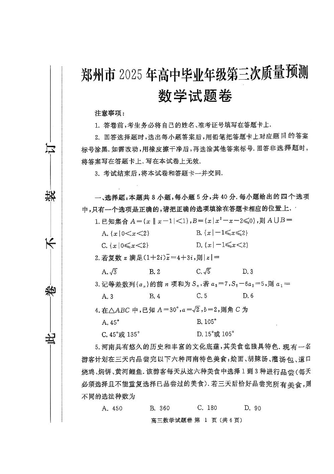 河南省郑州市2024-2025学年下学期高三第三次质量预测数学