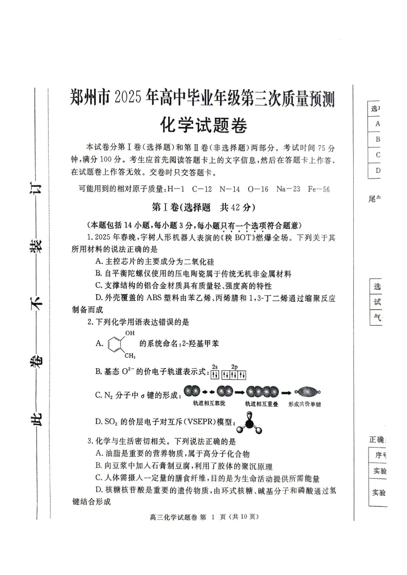 河南省郑州市2024-2025学年下学期高三第三次质量预测化学