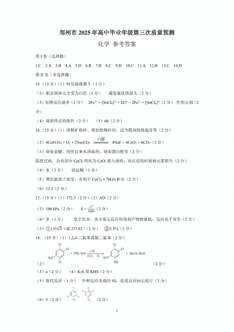 河南省郑州市2024-2025学年下学期高三第三次质量预测化学答案