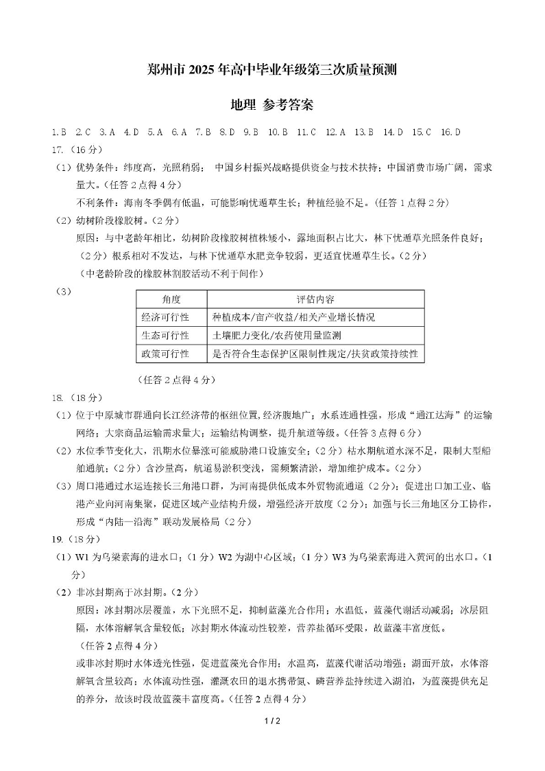 河南省郑州市2024-2025学年下学期高三第三次质量预测地理答案