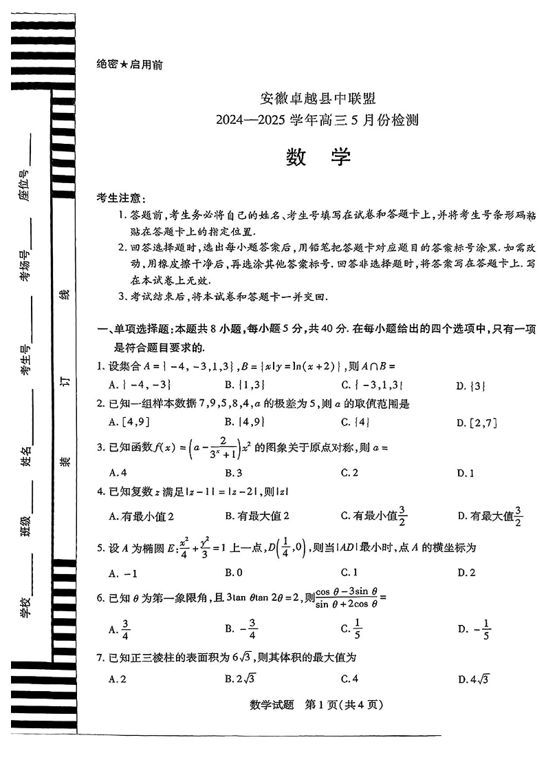 安徽省卓越县中联盟2024-2025学年下学期5月高三检测数学+答案