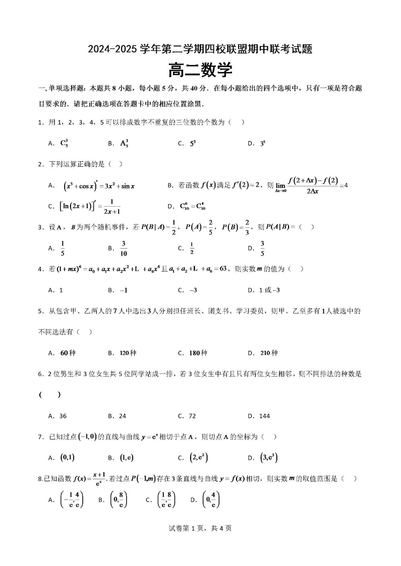 广东省清远市四校联盟2024-2025学年下学期高二期中联考数学+答案