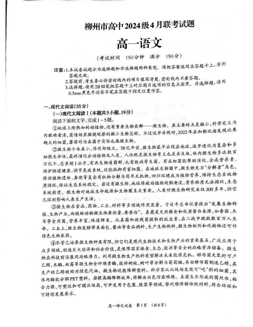 广西柳州市2024-2025学年下学期4月高一联考语文+答案