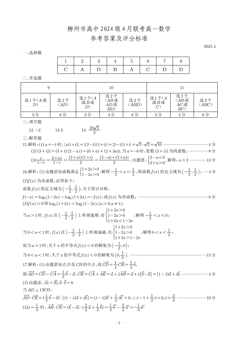广西柳州市2024-2025学年下学期4月高一联考数学答案
