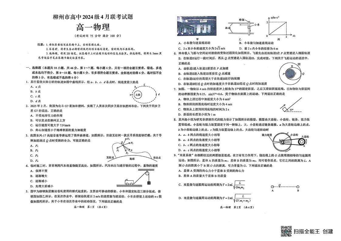 广西柳州市2024-2025学年下学期4月高一联考物理+答案