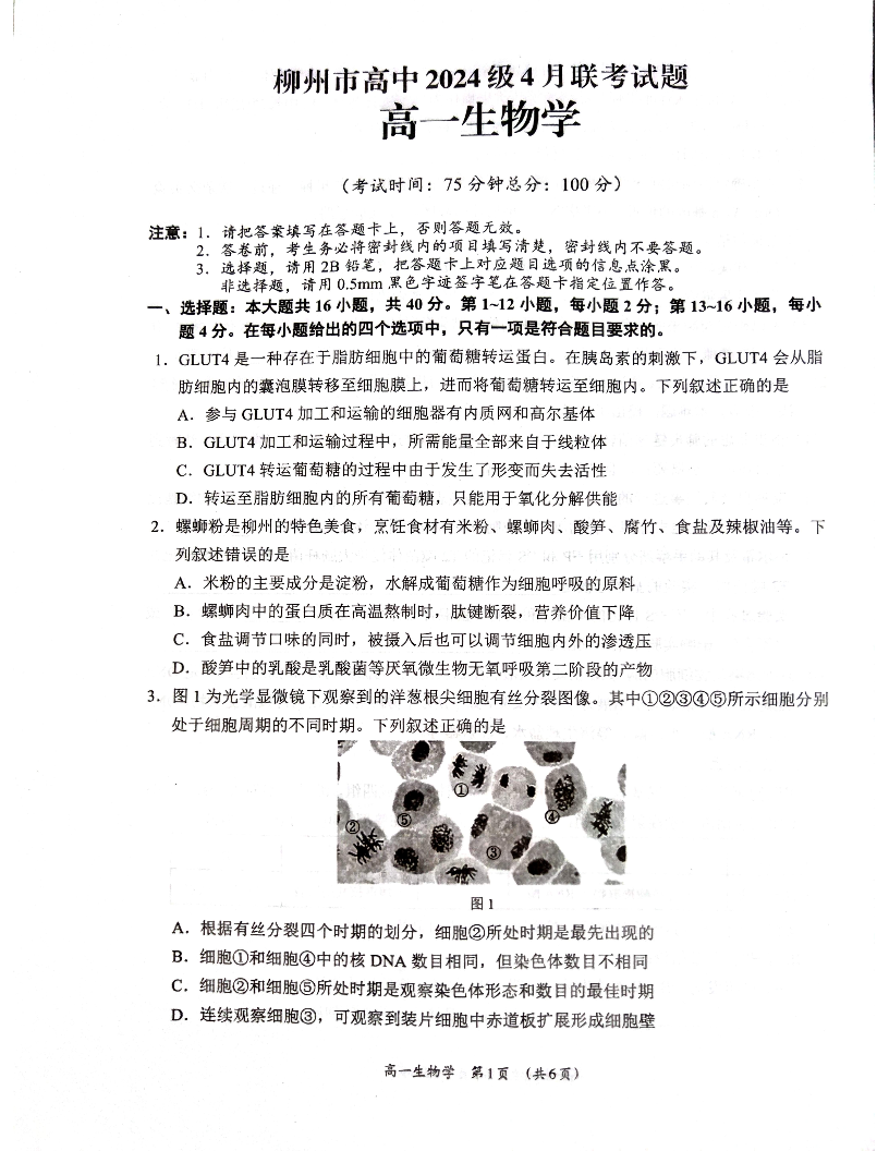 广西柳州市2024-2025学年下学期4月高一联考生物