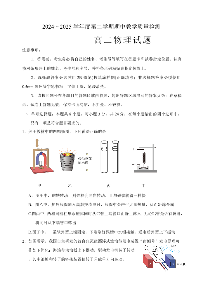 山东省济宁市邹城市2024-2025学年下学期高二期中教学质量检测物理+答案