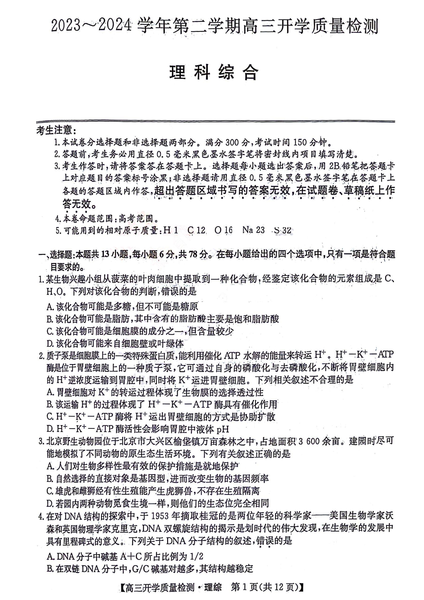 2024山西卓越联盟高三开学质量检测(243577Z)理综